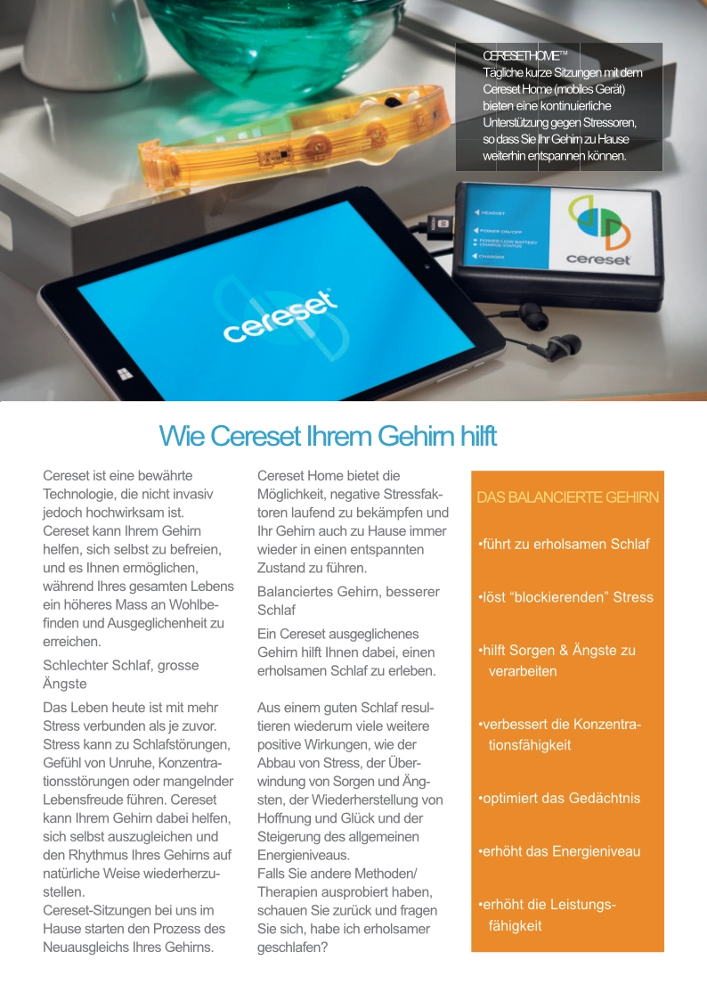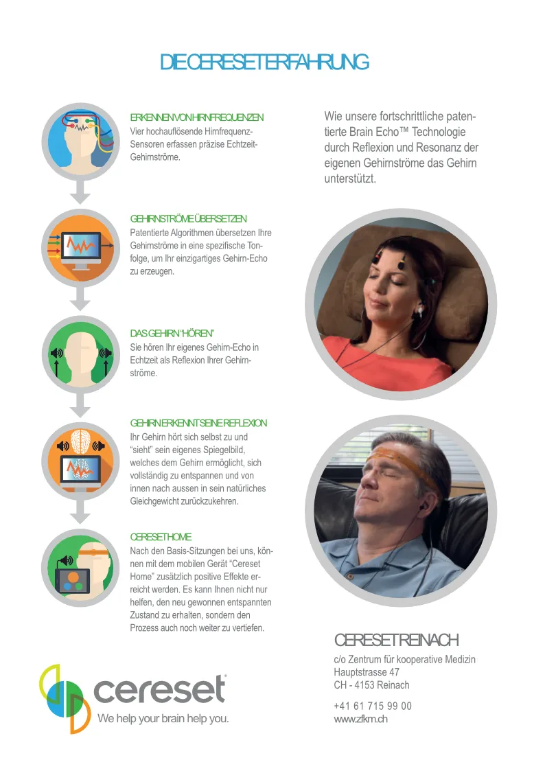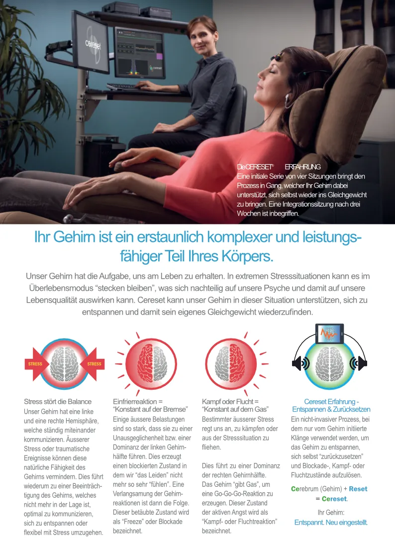 Das Gehirn ist Ihre zentrale Kommandozentrale. Es steuert und kontrolliert diverse Prozesse und Systeme in Ihrem Körper. Wenn Ihr Gehirn aus dem Gleichgewicht gerät und in bestimmten Bereichen überaktiv ist, ist es unmöglich, auf höchster Ebene zu funktionieren. Es fällt Ihnen schwer sich zu erholen, schlechter Schlaf kann sich einstellen, die Leistung nimmt stetig ab. Cereset ® ist eine bewährte Technologie, die nicht invasiv und hochwirksam ist. Cereset ® kann Ihrem Gehirn helfen, sich selbst zu harmonisieren und ein höheres Mass an Wohlbefinden und Ausgeglichenheit zu erreichen.
